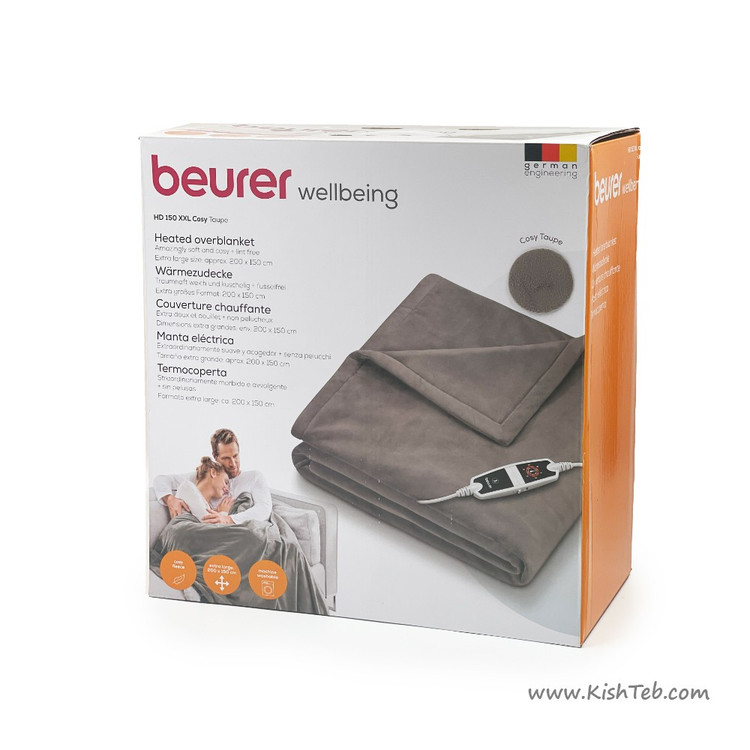 پتوی برقی بیورر مدل HD XXL150 با طراحی زیبا و کیفیت عالی یک انتخاب مناسب برای کسانی که به دنبال گرمایش راحت و ایمن در فصل سرد هستند ، این پتوی برقی با ابعاد 150 در 200 سانتیمتر میتواند تمام بدن شما را پوشش دهد و با جنس مخملی نرم و لطیف رویه خود به شما احساس آرامش و آسایش بدهد. پتوی برقی بزرگ بیورر دارای تنظیم ۶ درجه حرارت مختلف میباشد این پتوی برقی دارای سیستم خود خاموشی خودکار است که پس از ۳ ساعت به صورت اتوماتیک پتو را خاموش میکند