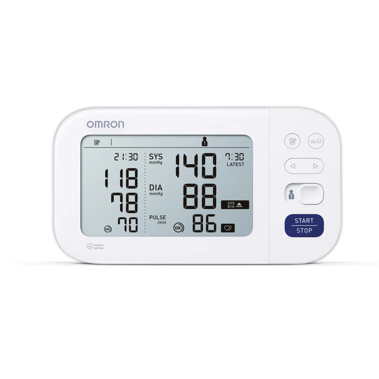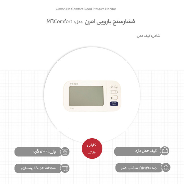 فشارسنج بازویی مدل M6 Comfort، محصولی با یک طراحی منحصربهفرد از شرکت امرن است. سایز کاف فشارسنج برای اندازهی دور بازو 22 تا 42 سانتیمتر مناسب است. این فشارسنج، فشار را مانند اکثر فشارسنجها با واحد میلیمتر جیوه نمایش میدهد و خطای آن حداکثر 3 میلیمتر جیوه است. این محصول قابلیت نمایش تعداد ضربان قلب در یک دقیقه را دارد. چنانچه ضربان قلب شخص نامنظم باشد، نشانگر آریتمی روی صفحه ظاهر میشود. انرژی این فشارسنج از طرق 4 عدد باتری قلمی تامین میشود. این فشارسنج دارای 200 حافظه برای دو کاربر است و نتایج فشار و ضربان قلب همراه تاریخ و زمانشان داخل این حافظهها ذخیره میشوند؛ در مراجعات بعدی میتوان با فشردن دکمه مربوطه، حافظه نتایج را از آخرین تستها به ترتیب مشاهده کرد. ابعاد این فشارسنج 191 × 120 × 85 میلیمتر بوده و وزن آن تنها 532 گرم است. یک کیف محکم برای نگهداری و حمل آسانتر فشارسنج همراه آن ارائه شده است. بهطور خلاصه فشارسنج بازویی امرن مدل M6 Comfort، دارای قابلیت محاسبهی فشار و ضربان قلب، تشخیص ضربان قلب نامنظم، منبع انرژی باتری نیم قلمی و محفظه نگهداری است.